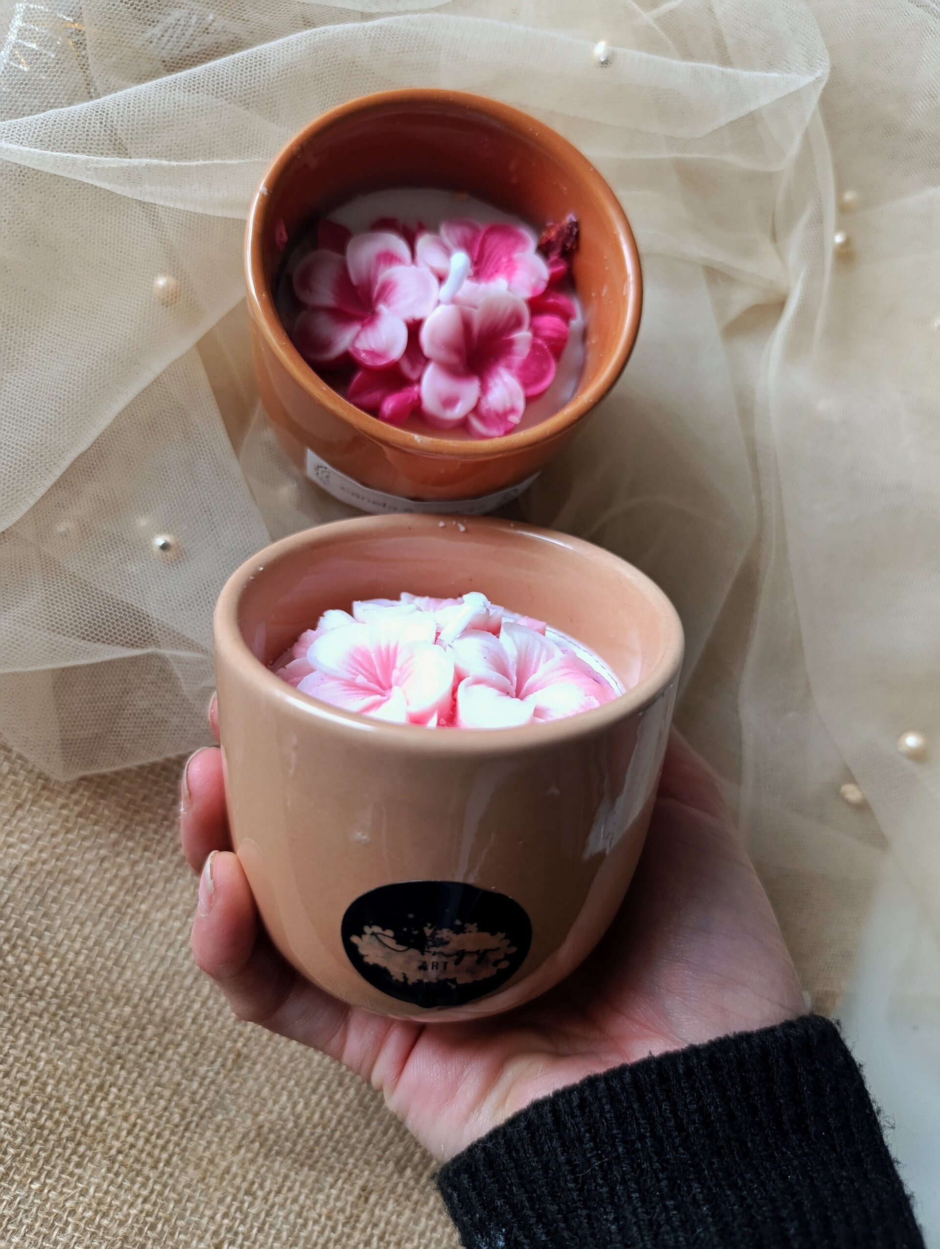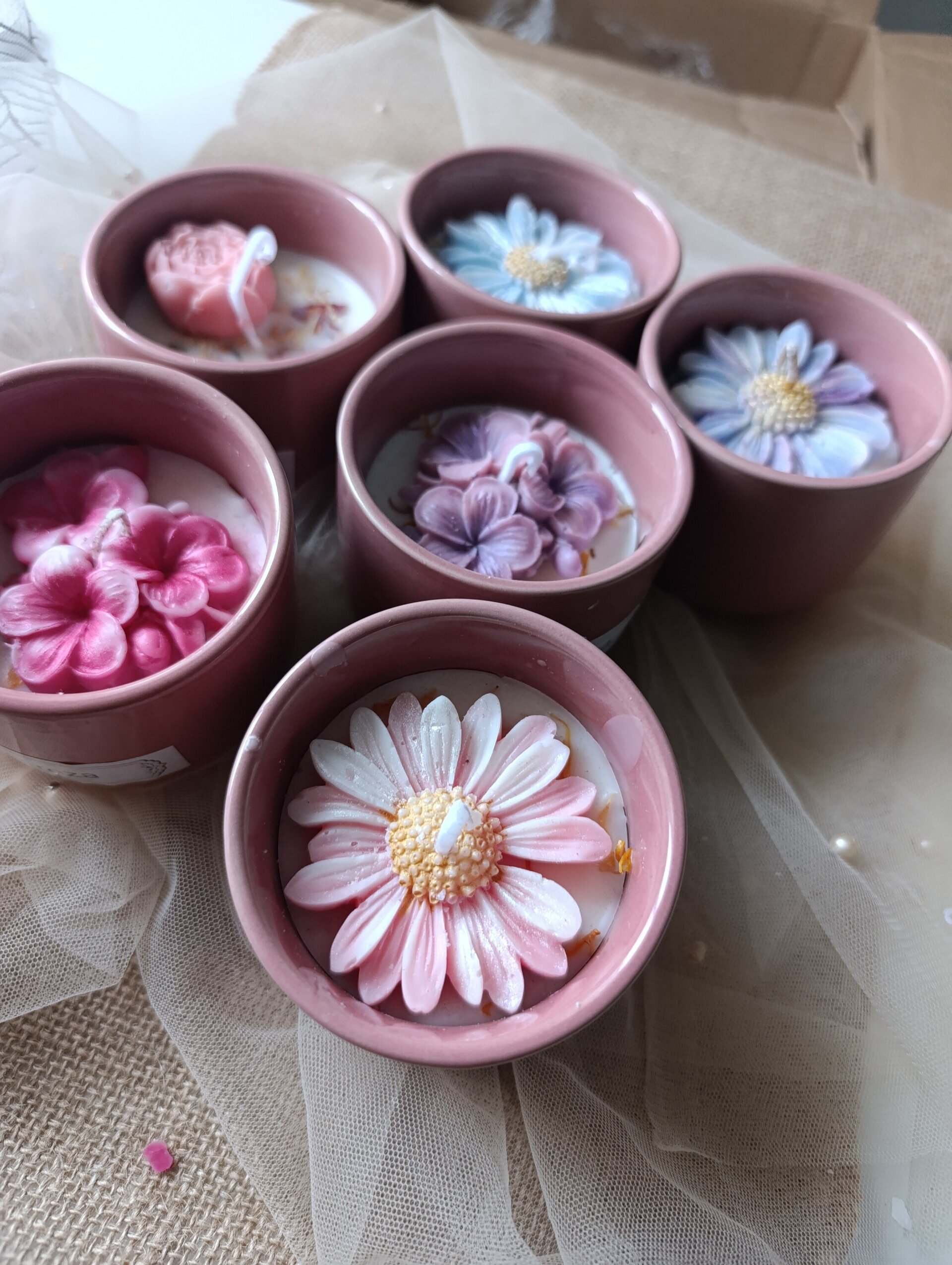 Velas en vaso de cerámica con flores, hechas a mano para llenar de luz, aroma y belleza cada momento. Un detalle que decora y acompaña con calma. Encargos personalizados ✨